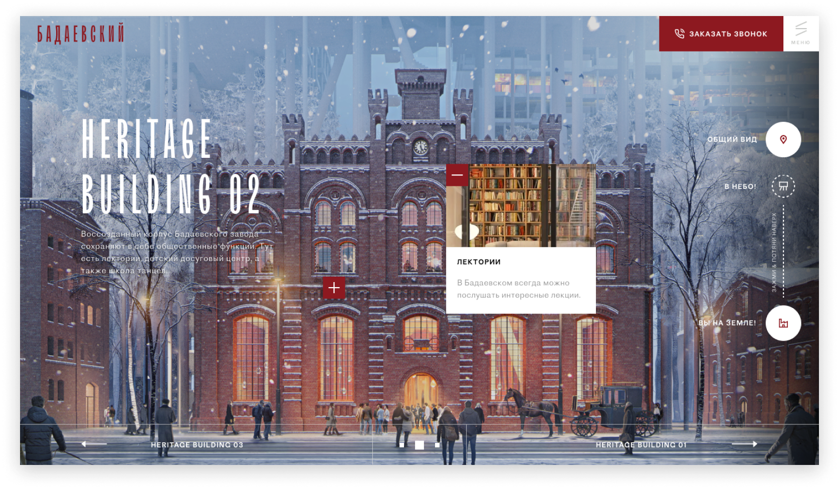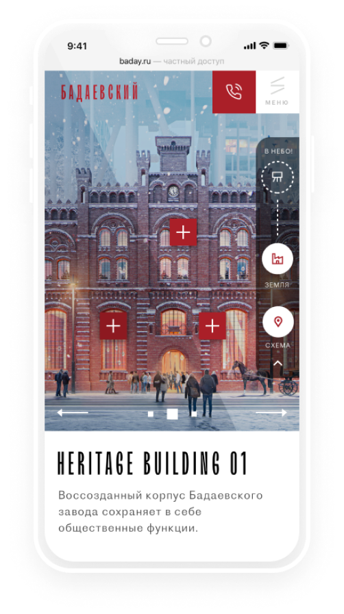 Бадаевский - комплекс на территории бывшего завода. Мы с командой участвовали в тендере на разработку сайта и предложили две креативных идеи.
