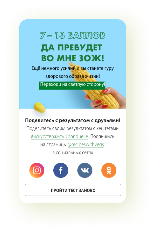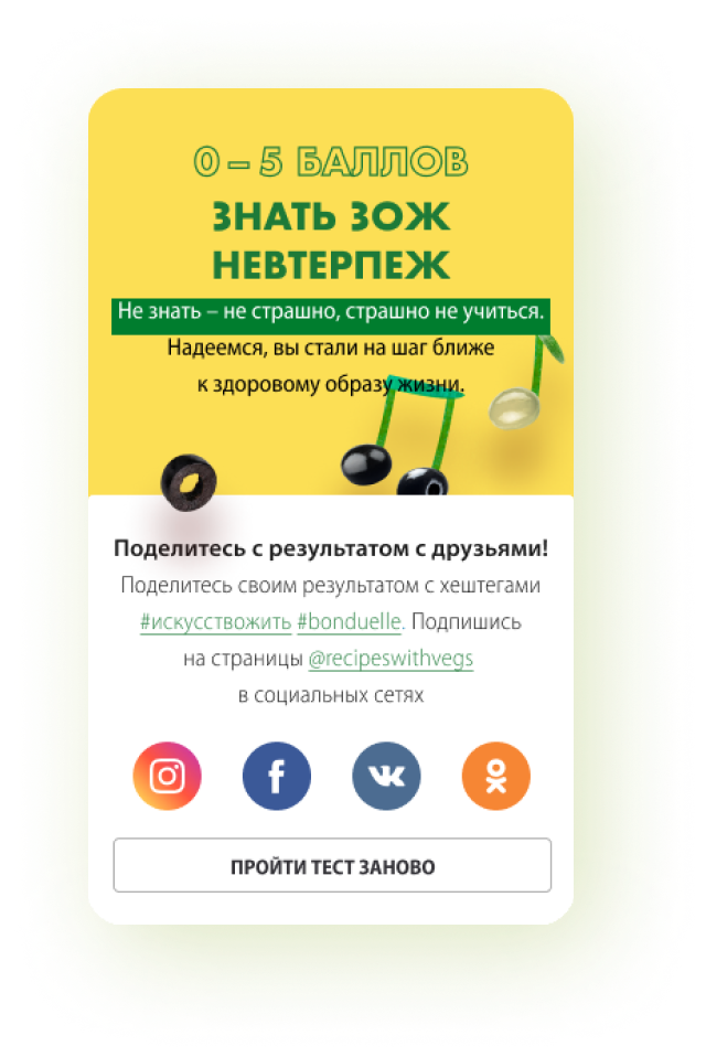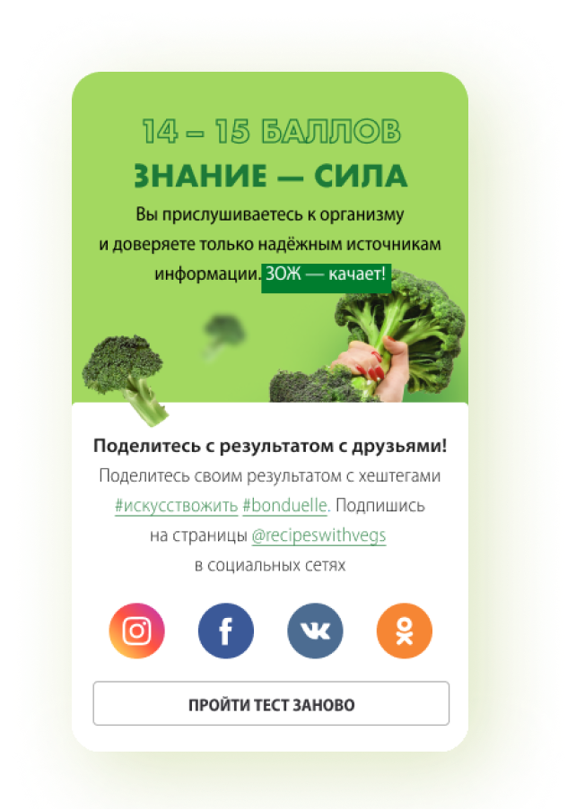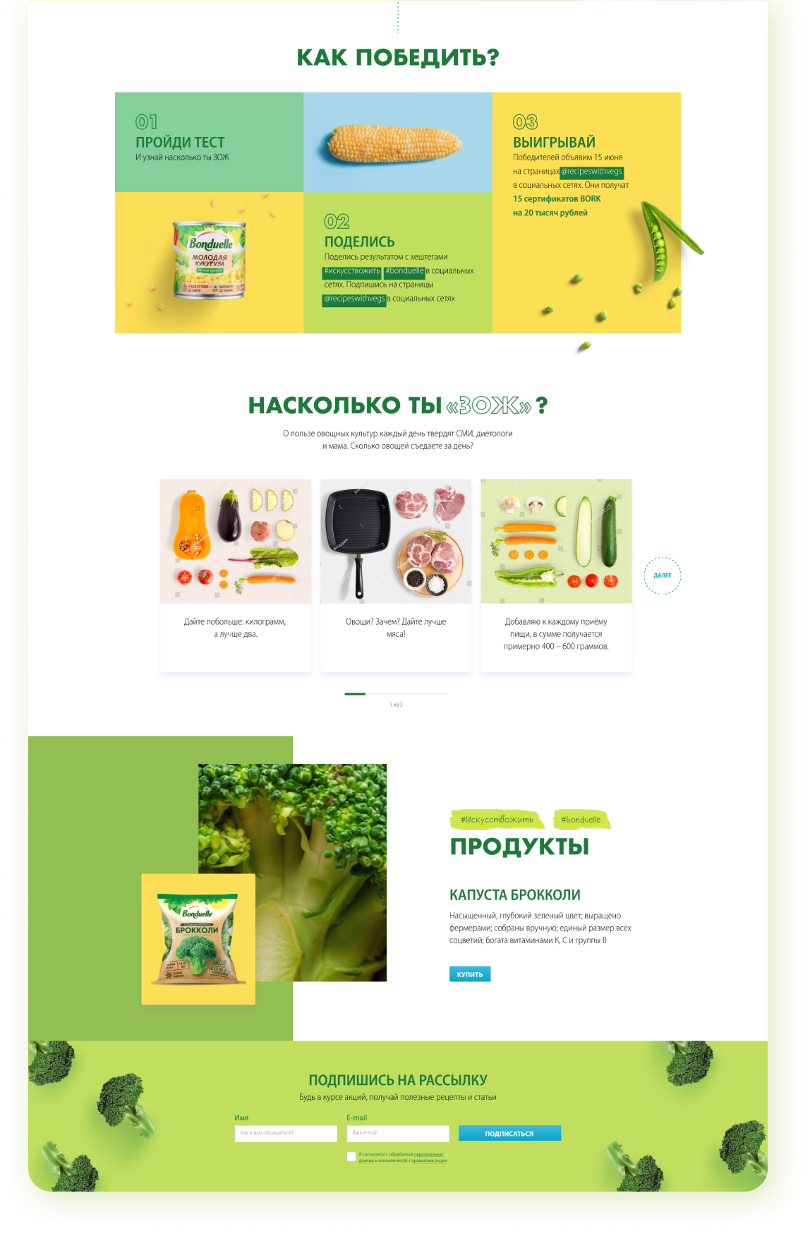 Ежегодно для компании Bonduelle, мы с командой делали по несколько лендингов под разные активации. "Насколько ты ЗОЖ?" - самый сочный из всех. Клиент захотел двигаться в сторону минимализма в дизайне, поэтому мы решили сделать акцент на аппетитных овощах и ярких цветах.